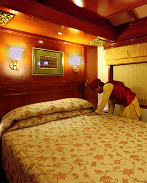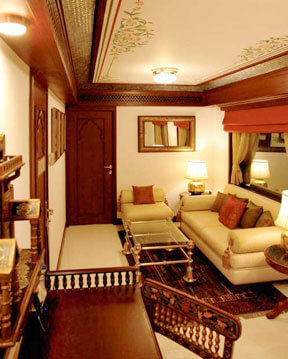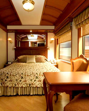 On board The Maharajas’ Express, the elegantly designed Junior Suite offers panoramic windows, modern comforts, and refined interiors inspired by precious gemstones. Each suite is air-conditioned and equipped with Wi-Fi, entertainment facilities, and attended by a dedicated valet for personalized service. Advanced safety features and attentive hospitality ensure a secure, seamless, and truly royal journey across India.