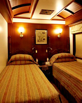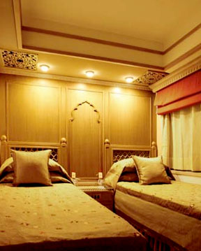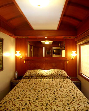 Aboard The Maharajas’ Express, the opulent Suite spans 220 sq. ft., featuring panoramic windows, elegant gemstone-inspired décor, and unmatched space on rails. Each double-bedded suite includes a mini-pantry service, complimentary mini-bar, bathtub, and a dedicated valet for attentive hospitality. Your journey is further enhanced with a private guide, luxury car for excursions, and advanced safety features for a seamless royal experience.